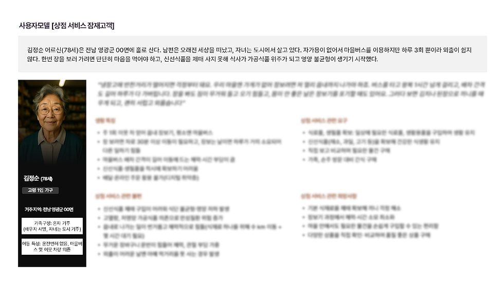 “냉장고에 반찬거리가 떨어지면 걱정부터 돼요. 우리 마을엔 가게가 없어 장보려면 저 멀리 읍내까지 나가야 하죠. 버스를 타고 왕복 1시간 넘게 걸리고, 배차 간격도 길어 하루가 다 가버립니다. 장을 봐도 짐이 무거워 들고 오기 힘들고, 몸이 안 좋은 날은 장보기를 포기할 때도 있어요. 그러다 보면 김치나 된장으로 끼니를 때우게 되고,”